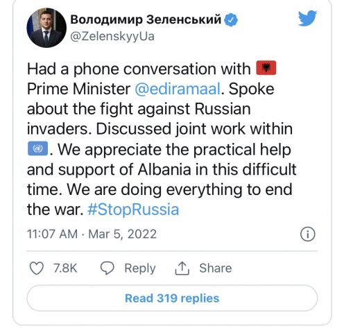 Presidenti ukrainas Volodymyr Zelenskyy ka biseduar me kryeministrin e Shqipërisë Edi Rama me të cilin ka biseduar për invazionin rus në Ukrainë dhe punën e përbashkët në OKB për rezolutën e miratuar kundër agresionit rus.