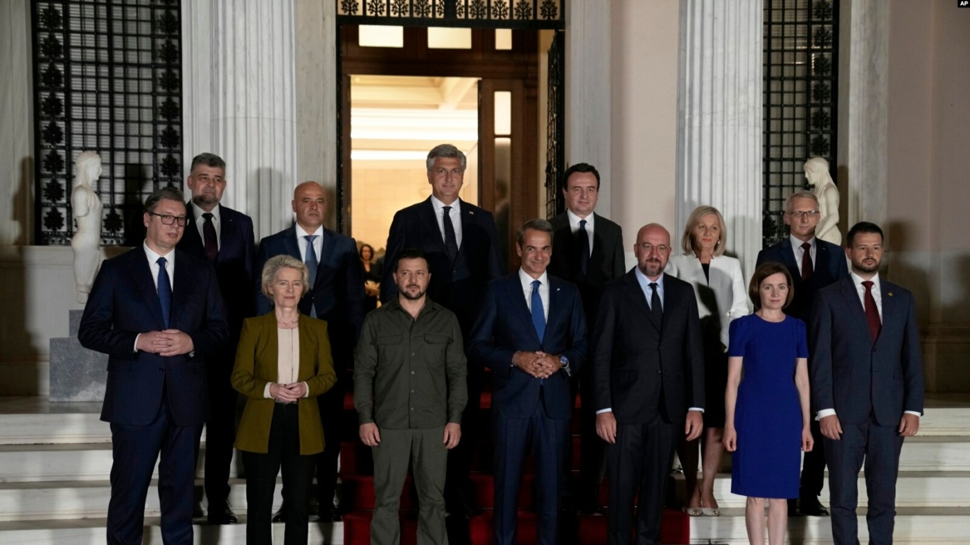 Presidenti Zelensky mori pjesë gjithashtu në një darkë të shtruar nga Mitsotakis për zyrtarë të lartë të 9 vendeve të Ballkanit, Presidenten e Komisionit Europian Ursula von der Leyen si dhe Presidentin e Këshillit Europian Charles Michel./abcnews.al