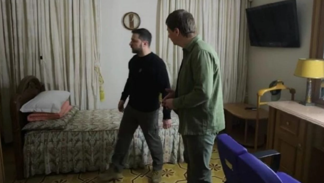 Po aty, Zelensky tregon për herë të parë gazetarit Dmytro Komarov, dhomën ku ka fjetur natë plot ankthe përgjatë gjithë këtij viti./A2