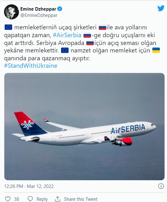 Zëvendësministrja e parë e Punëve të Jashtme në Ukrainë, Emine Dzheppar ka thënë se teksa vendet e Bashkimit Evropian dhe disa vende të tjera ndaluan fluturimet për avionët rus dhe pezulluan fluturimet në Rusi, AirSerbia ka dyfishuar fluturimet direkte për linjat ajrore për në Moskë.