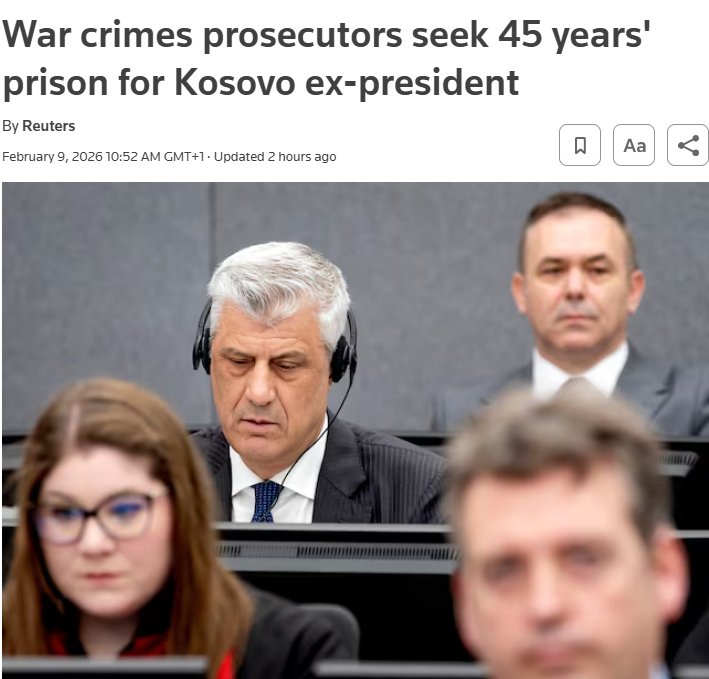 Reuters raporton se prokurorët ndërkombëtarë për krime lufte kanë kërkuar dënim me 45 vjet burg për ish-presidentin e Kosovës, Hashim Thaçi, dhe tre të bashkëakuzarit, ish-komandantë të Ushtrisë Çlirimtare të Kosovës (UÇK).