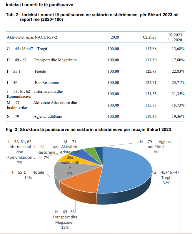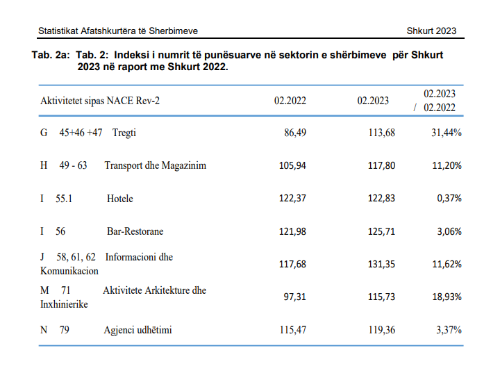 Ndryshe, ASK-ja ka publikuar të dhënat vetëm në muajin Shkurt të vitit 2023, ku numri i të punësuarve në sektorët e shërbimeve krahasuar me muajin e njëjtë të vitit 2022, kishte rritje te këto grupe: Tregti 31.44%, Aktivitete Arkitekture dhe Inxhinierike 18.93%, Informacioni dhe Komunikacion 11.62%, Transport dhe Magazinim 11.2%, Agjenci udhëtimi 3.37%, Bar-Restorane 3.06%, Hotele 0.37%/Arbresh.info/Diellza Gashi/