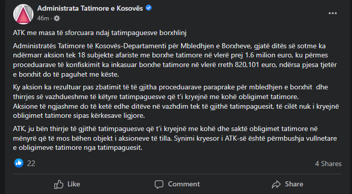 Ky aksion ka rezultuar pas zbatimit të të gjitha procedurave paraprake për mbledhjen e borxhit dhe thirrjes së vazhdueshme ndaj këtyre tatimpaguesve që t’i kryejnë me kohë obligimet tatimore.