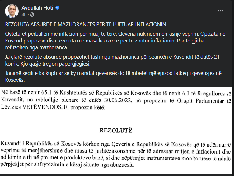 Ish-kryeministri dhe deputeti i LDK-së, Avdullah Hoti, ka kritikuar rezolutën e përpiluar nga Lëvizja Vetëvendosja, për luftimin e inflacionit në nivel të vendit.