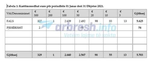 Tutje, në përgjigje thuhet se, gjatë vitit 2021 kanë pranuar 5.703 raste të kartëmonedhave fals, ku edhe në vitin 2021 ka dominuar vlera prej 100 euro më 2.640 raste.