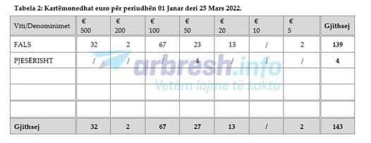 Nga kjo Agjenci për arbresh.info thonë se, gjatë vitit 2022 në periudhën janar-mars, kanë pranuar 143 kartëmonedha fals, ku më e falsifikuara është vlera prej 100 euro dhe 50 euro.