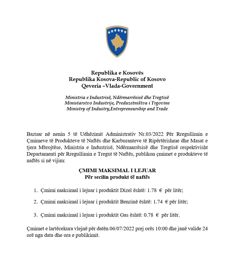 Sipas njoftimit, çmimi maksimal i lejuar i gazit ka mbetur i njëjtë krahasuar një ditë më parë, pra me 0.78 euro kurse nafta është liruar për 1 cent e benzina për 2 cent.