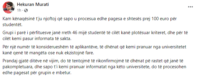Megjithatë, Ministri Murati tha se ditëve në vijim do të bëhet edhe njëherë verifikimi i informatave në mënyrë që të bëhet procesimi i pagesave edhe për grupin e mbetur të studentëve.