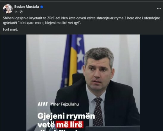 “Shiheni qasjen e kryetarit të ZRrE-së! Nën këtë qeveri është shtrenjtuar rryma 3 herë dhe i ofendojnë qytetarët “bëni qare more, blejeni ma lirë vet qy!”. Fort mirë”, shkroi Mustafa.