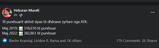 Murati ka publikuar numrin e të punësuarve aktivë në muajin maj 2019, duke e krahasuar me të punësuarit aktiv në maj të vitit 2019.