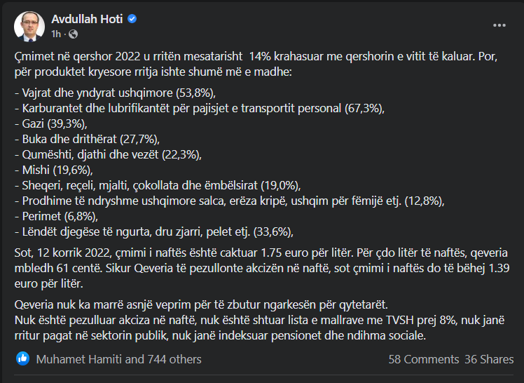 Me anë të një postimi në Facebook, ai u shpreh se çmimet në qershor 2022 u rritën mesatarisht 14% krahasuar me qershorin e vitit të kaluar, dhe se për produktet kryesore rritja ishte shumë më e madhe.