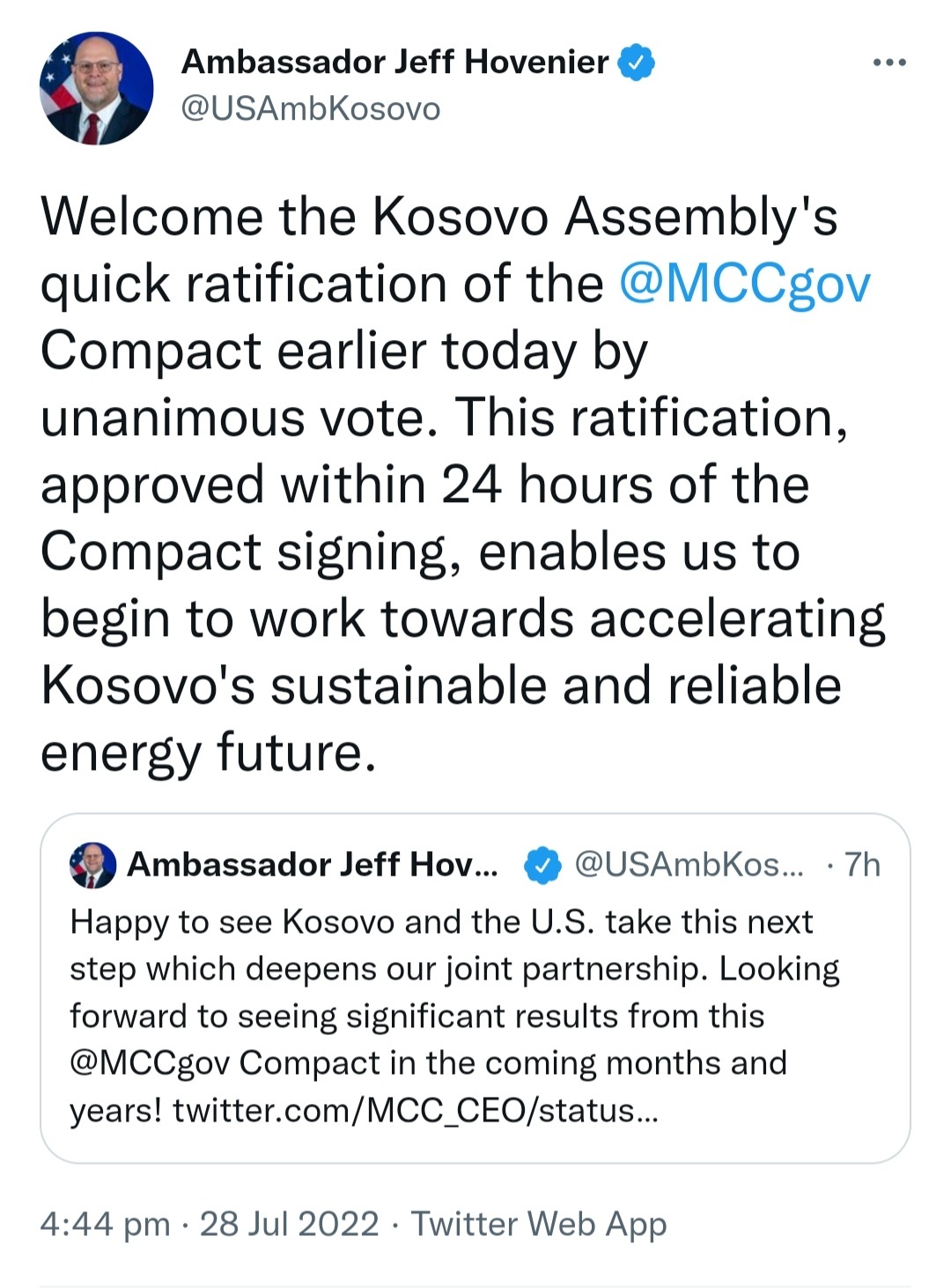 Ambasadori i SHBA-së në Prishtinë, Jeffrey Hovenier, ka reaguar pasi Kuvendi i Kosovës me 2/3 e votave e ka ratifikuar marrëveshjen në mes të Kosovës dhe MCC-së.