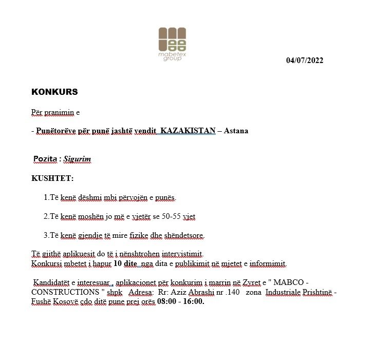 Kandidatët e interesuar , aplikacionet për konkurim i marrin në Zyret e ” MABCO – CONSTRUCTIONS ” shpk Adresa: Rr: Aziz Abrashi nr .140 zona Industriale Prishtinë – Fushë Kosovë çdo ditë pune prej orës 08:00 – 16:00./arbresh.info/