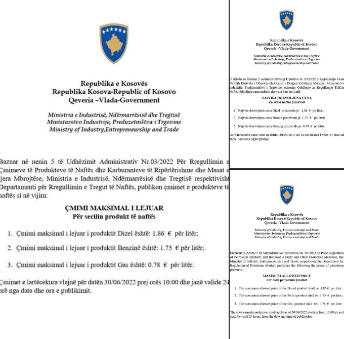 Sipas njoftimit, çmimi maksimal i lejuar i naftës është 1.86 euro për litër, i gazit me 0.75 euro dhe i benzinës është rritur për 1 cent, pra sot tregtohet me 1.75 euro, shkruan arbresh.info.