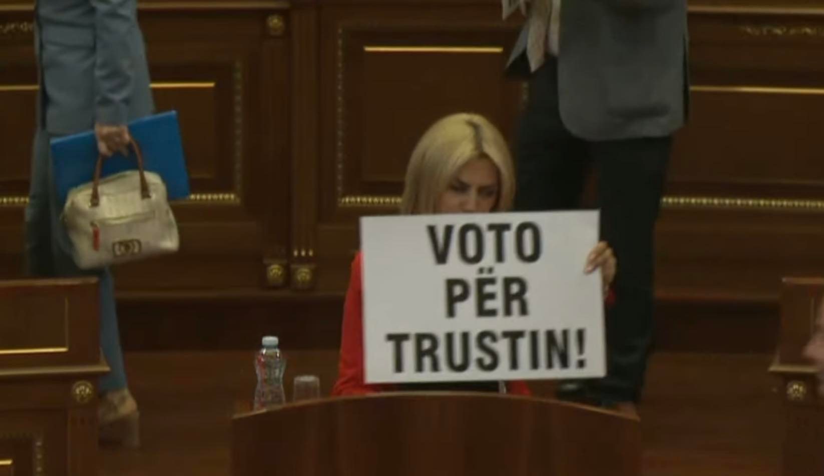 Grupi Parlamentar i Aleancës për Ardhmërinë e Kosovës ka hyrë në seancën e sotme me pankartat “Voto për Trustin”.