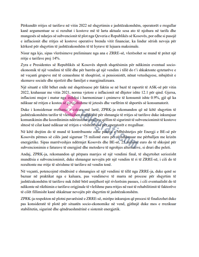 “ZPRK-ja rekomandon që në këtë shqyrtim të jashtëzakonshëm tarifor të vlerësohen mundësitë për shmangie të rritjes së tarifave duke inkurajuar komunikimin dhe koordinimin ndërinstitucional me qëllim të sigurimit të subvencionimit të kostove shtesë të cilat kanë ndikuar në rritjen e vështirësive për operatorët e rregulluar”, vijon ZPRK-ja.
