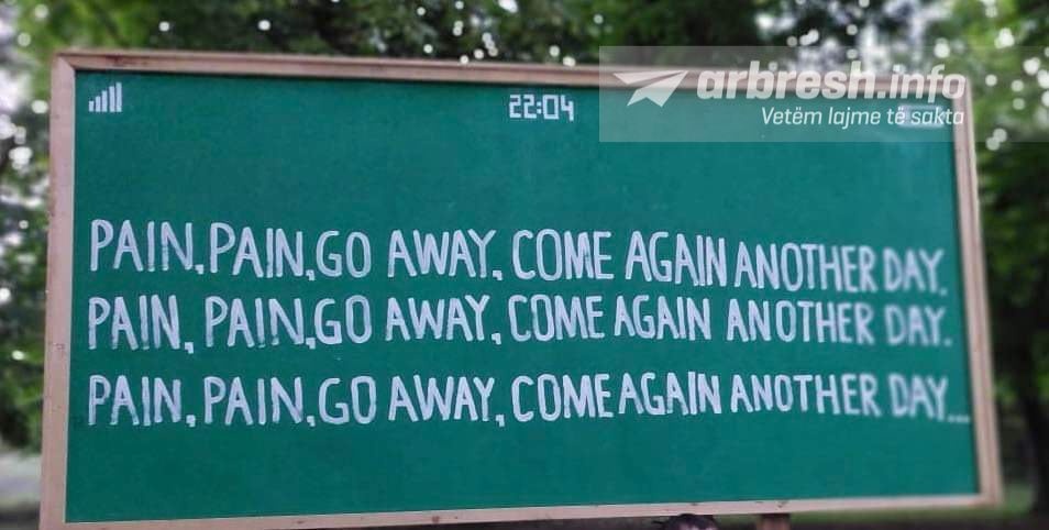 “Dhimbje, dhimbje largohu, eja prap një ditë tjetër” është shkruar në këtë tabelë që duket se është më e madhe se 10 m2, shkruan arbresh.info.