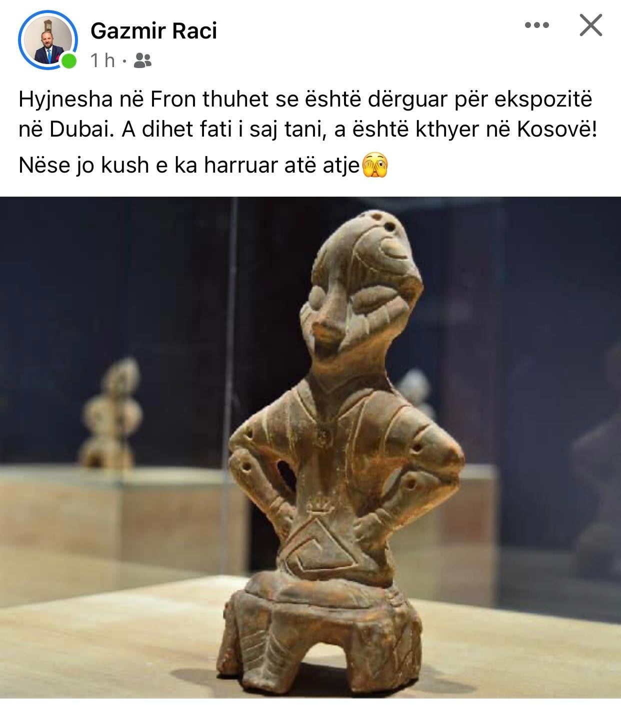 Njohësi i rrethanave politike në vend, Gazmir Raci, ka pyetur institucionet e Kosovës nëse është kthyer në vend ‘Hyjnesha në Fron’, pas një ekspozite në Dubai.