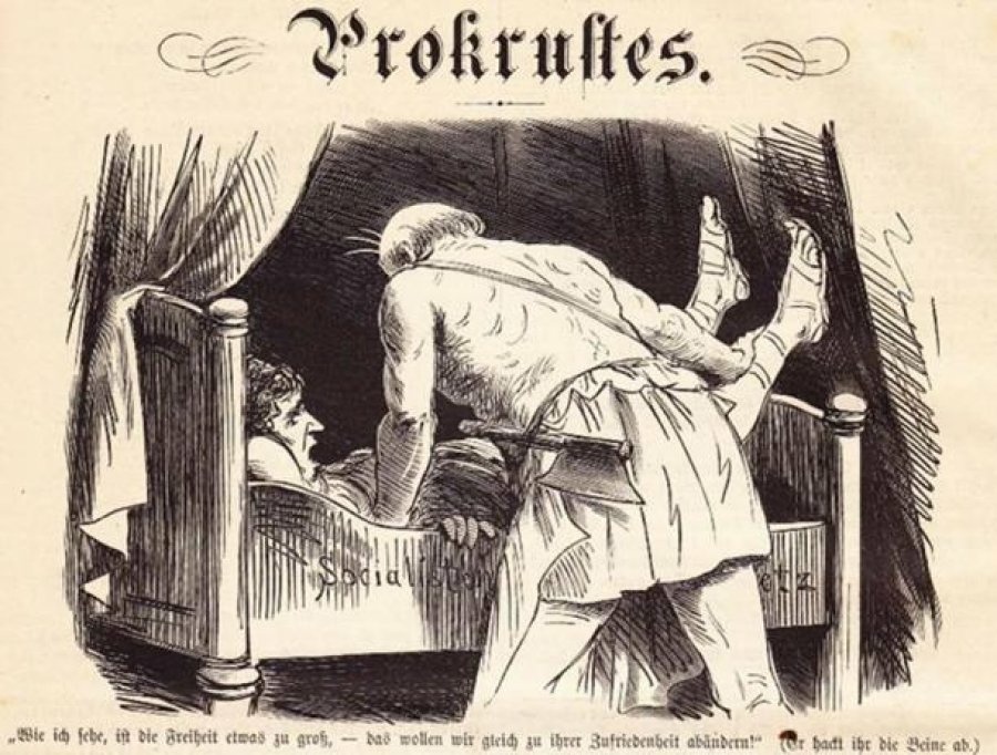 Një figurë nga mitologjia greke, Prokrustesi, i njohur gjithashtu si “tendosësi”, ishte i njohur për metodën e tij sadiste të vrasjes. Ai joshte udhëtarët në bujtinën e tij, ku i detyronte të uleshin në një shtrat hekuri ose duke i tendosur trupin ose duke i prerë gjymtyrët.