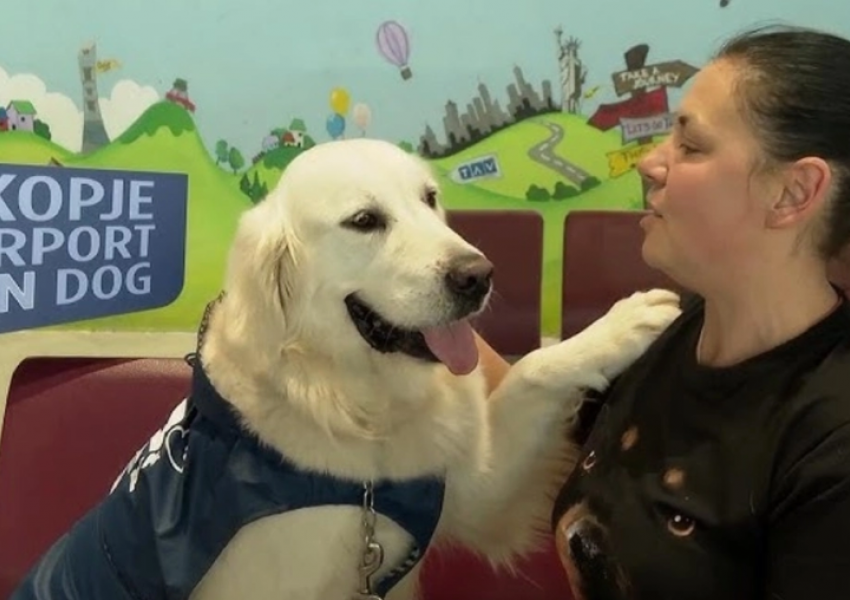 Udhëtarët nervozë në Aeroportin e Shkupit, të cilët janë në ankth dhe nuk ndihen të gatshëm për të udhëtuar me avion, e kanë në dispozicion në sallën e nisjeve Dino-n, retriverin e artë, që i ndihmon të relaksohen.