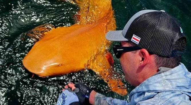 Një zbulim i jashtëzakonshëm ka ndodhur pranë Parkut Kombëtar Tortuguero në Kosta Rika, ku gjatë një udhëtimi peshkimi është kapur një peshkaqen me ngjyrë portokalli të ndezur, i pari i këtij lloji i dokumentuar ndonjëherë, raporton BBC.