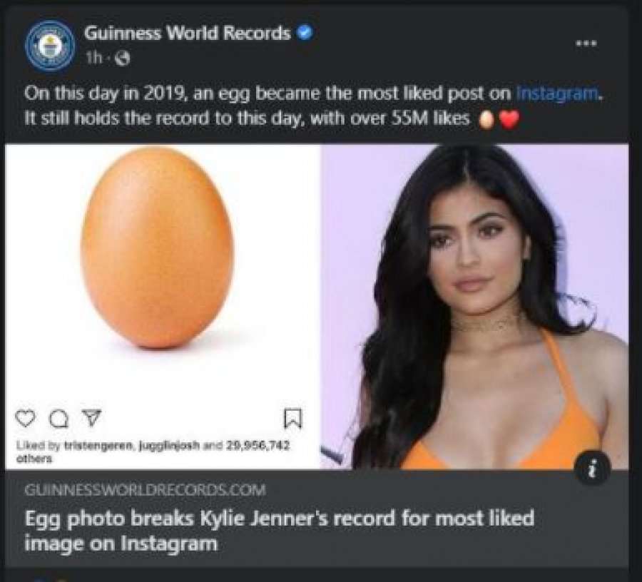 Libri i Rekordeve Guinness e ka vlerësuar në një postim fotografinë me mbishkrimin se “një vezë u bë postimi më i pëlqyer në Instagram më 2019. Ende mban rekordin edhe kësaj dite me mbi 55 milionë pëlqime”.