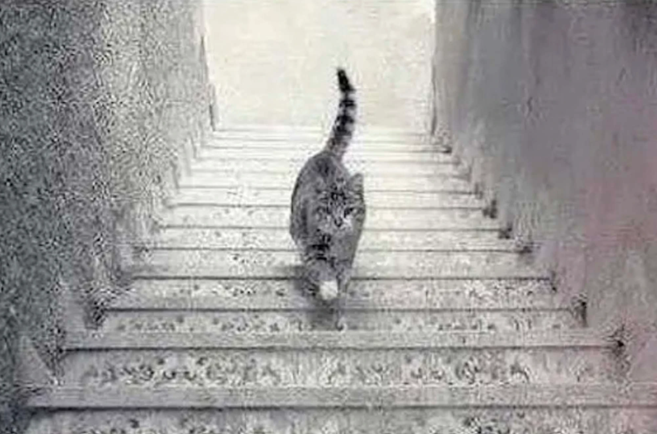 Imazhi në shkallë gri të shpërndarë nga The Minds Journal përshkruan një mace në një shkallë, transmeton arbresh.info.