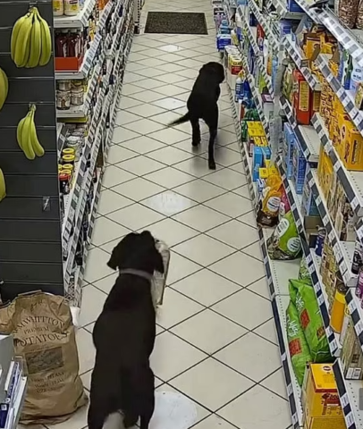 Pasi u kapën në flagrancë, punonjësit e dyqanit shpejt bashkuan qentë me pronarin e tyre të ligjshëm.
