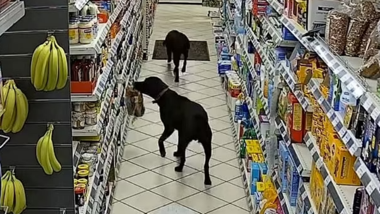 Një video qesharake po qarkullon në rrjete sociale dhe tregon dy qenë të racës labradorë duke hyrë në një pompë benzini dhe duke “vjedhur” bukë nga rafti.