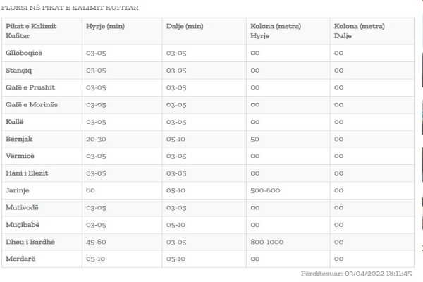 Në Bërnjak, pritjet për të hyrë në Kosovë nga Serbia janë 20 deri në 30 minuta. Ndërsa te Dheu i Bardhë janë prej 45 minuta deri 60 minuta. Në pikën tjetër kufitare Jarinje pritjet janë 60 minuta, sipas të dhënave të orës 18:11.