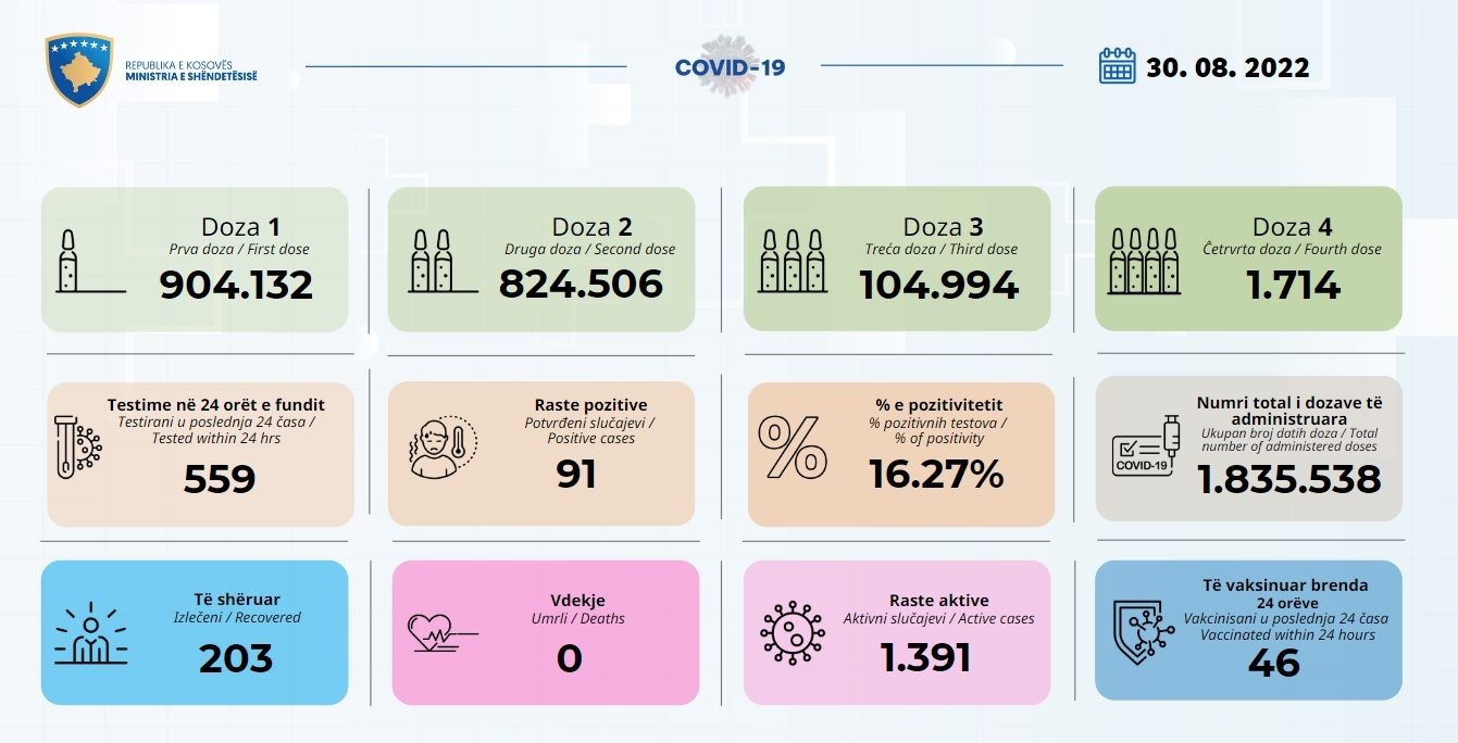 Ministria e Shëndetësisë bën të ditur se në 24 orët e fundit nga 559 testime janë shënuar 91 raste të reja me Covid-19 në Kosovë.