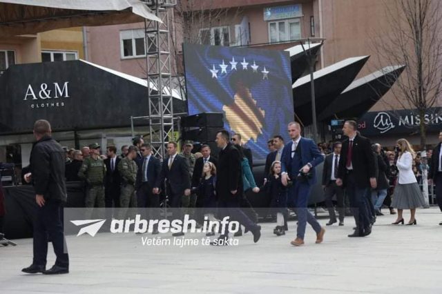 Ashtu siç shihet edhe në foto, truprojet janë përkujdesur për sigurinë e presidentes Vjosa Osmani, e cila ka kaluar përmes qytetarësh deri ka arritur tek podiumi ku po e prisnin kryeministri Kurti dhe kryekuvendari Konjufca.