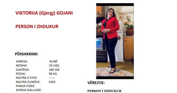 Policia e Kosovës – Drejtoria Rajonale e Policisë në Pejë, bazuar në ligj për publikimin e fotos me shënime tjera të personit të zhdukur me autorizim të Prokurorisë Themelore Pejë, me qëllim lokalizimin e tij, lëshon: Kërkesë për bashkëpunim me qytetarët. Personi i zhdukur është: • VIKTORIJA (Gjergj) GOJANI e lindur me 10.05.2003 në Beograd-Serbi. … Continue reading Zhduket 19-vjeçarja nga Klina, Policia kërkon ndihmë nga qytetarët për gjetjen e saj