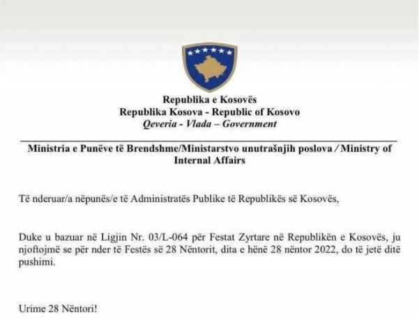 “Duke u bazuar në Ligjin Nr.03/L-064 për Festat Zyrtarë në Republikën e Kosovës, ju njoftojmë se për nder të Festës së 20 Nëntorit, dita e hënë 28 nëntor 2022, do të jetë ditë pushimi”, thuhet në njoftim./arbresh.info/