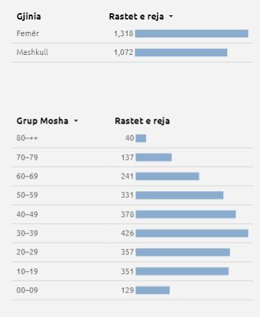 351 të infektuar janë të moshës 10-19 vjeç, ndërsa 357 të moshës 20-29 vjeç.