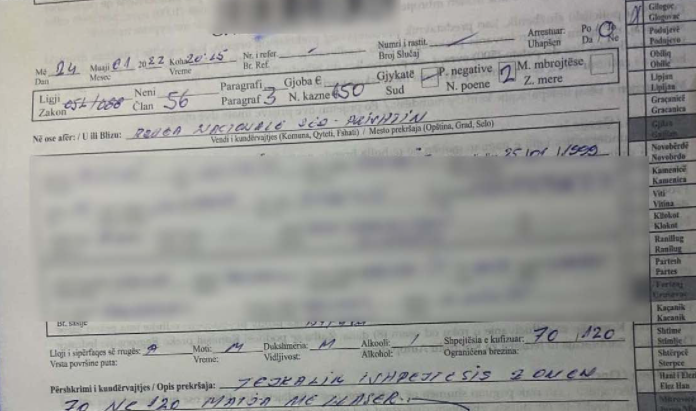 Policia e Kosovës ka njoftuar se ka gjobitur një person 150 euro, dhe 2 pikë negative, pasi voziti 121 km/h në zonën ku kufizimi i shpejtësisë është 70 km/h.