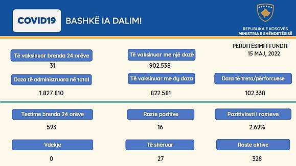 Ministria e Shëndetësisë ka bërë të ditur se 16 persona kanë rezultuar pozitivë me COVID-19 në Kosovë.