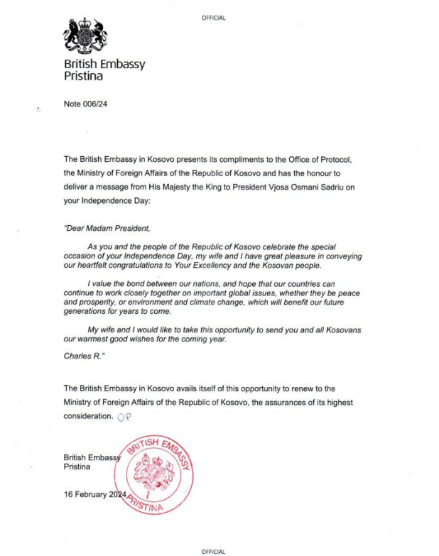Presidentja e Republikës së Kosovës, Vjosa Osmani në 16 vjetorin e pavarësisë së Kosovës, ka pranuar telegram urimi nga Mbreti i Mbretërisë së Bashkuar, Charles III.