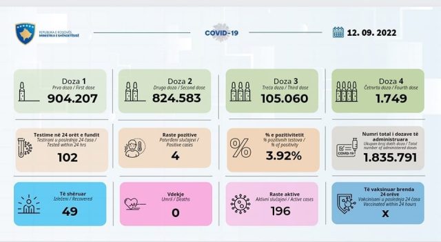 Ministria e Shëndetësisë ka bërë të ditur se janë 196 raste aktive me coronavirus në Kosovë.