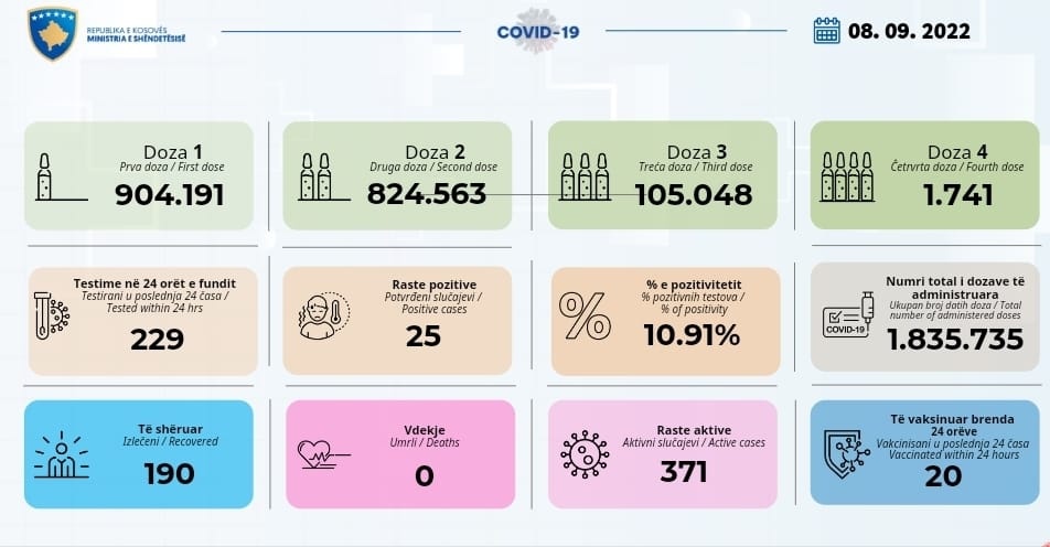 Sipas tyre gjatë 24 orëve të fundit janë shënuar 25 raste të reja me coronavirus në Kosovë, nga 229 testime të bëra si dhe janë shëruar 190 persona.