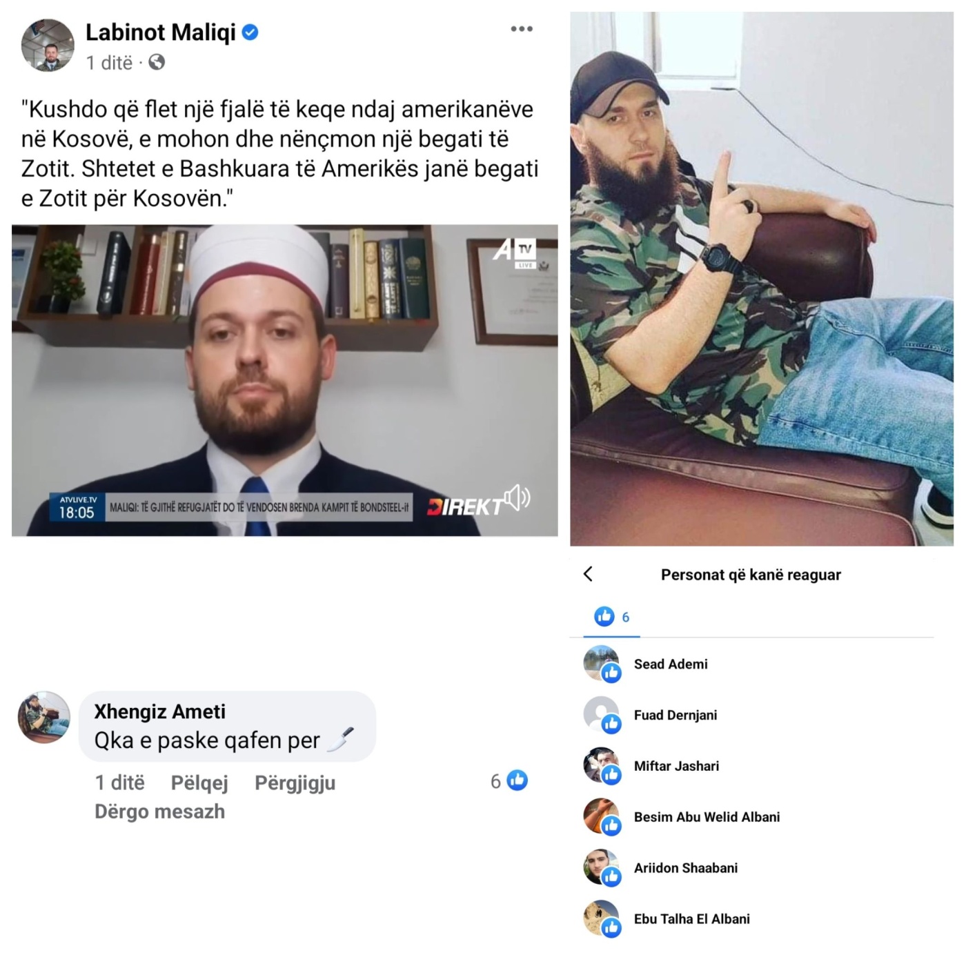 “Rastin e kam paraqitur në Policinë e Kosovës, dhe është duke u trajtuar në nivelin më të lartë. Personi në fjalë dyshoj se është shtetas i Maqedonisë së Veriut, andaj i bëjë thirrje organeve të sigurisë atje dhe prokurorisë që ta hetojnë këtë person, por dhe gjashtë personat e tjerë që e kanë pëlqyer kërcënimin e tij ndaj meje. Qentë e xhehnemit! Sa të mjerë që janë edhe në dunja!”, u shpreh Imam Maliqi./arbresh.info/