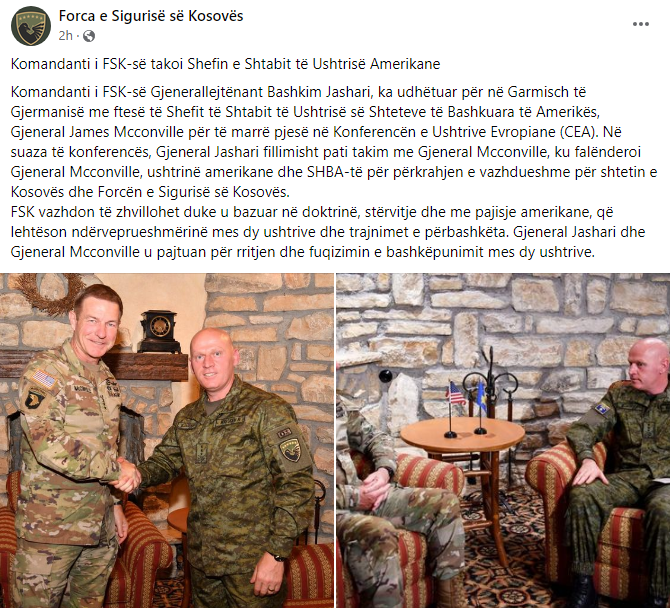 “FSK vazhdon të zhvillohet duke u bazuar në doktrinë, stërvitje dhe me pajisje amerikane, që lehtëson ndërveprueshmërinë mes dy ushtrive dhe trajnimet e përbashkëta. Gjeneral Jashari dhe Gjeneral Mcconville u pajtuan për rritjen dhe fuqizimin e bashkëpunimit mes dy ushtrive”, thuhet në postimin e FSK-së në Facebook./arbresh.info/