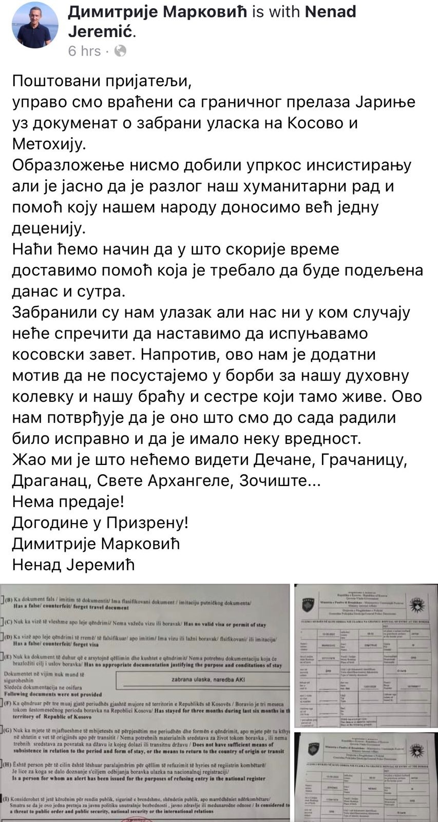 Institucionet e Republikës së Kosovës u kanë ndaluar sot hyrjen në Kosovë, Dimitrije Markoviq dhe Nenad Jeremiq.