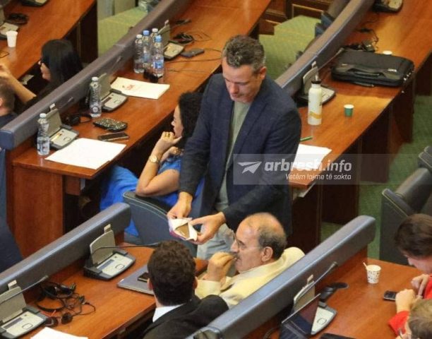 Deputeti i radhës së Lidhjes Demokratike të Kosovës (LDK), Arben Gashi, gjatë seancës që është duke u diskutuar për Trustin, Gashi është fotografuar duke u dhuruar çokollata deputetëve të Vetvendosjes.