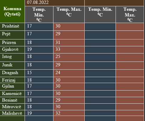 Sipas Institutit Hidrometeorologjik të Kosovës, temperaturat minimale do të lëvizin ndërmjet 15-19 gradë Celsius, ndërsa maksimalet e ditës parashihen të lëvizin ndërmjet 24-33 gradë Celsius.