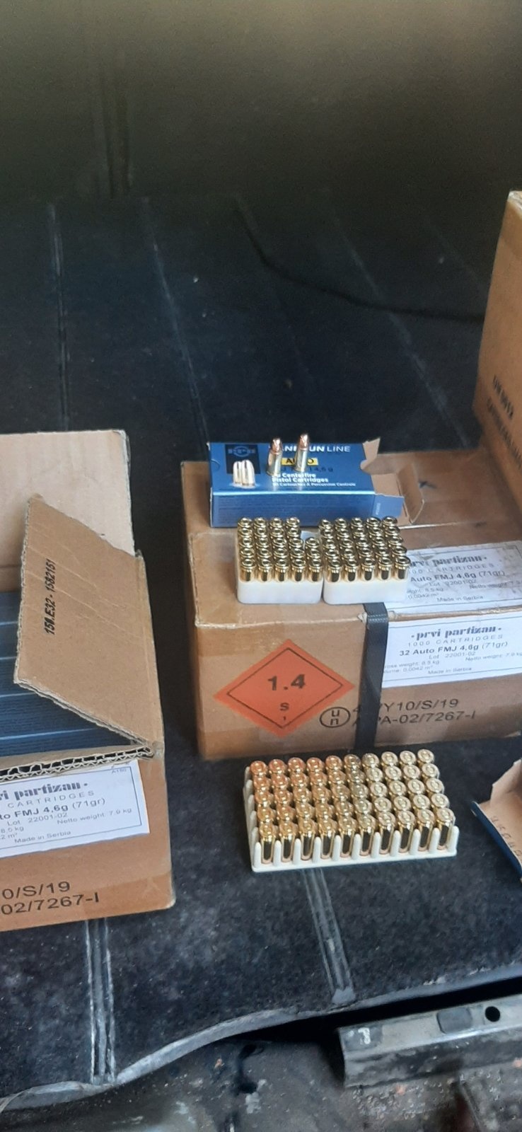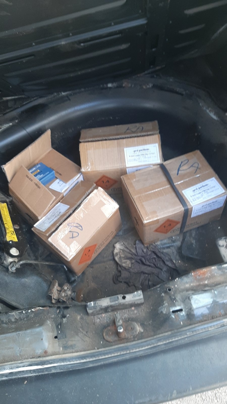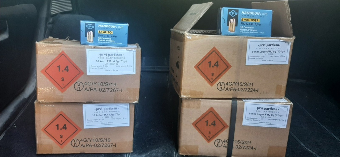 Gjatë kontrollimit në bagazhin e automjetit janë gjetur: katër pako të mëdha me gjithsej 4000 copë municion të llojeve të ndryshme të fshehura tek vendi i gomës rezervë të automjetit.