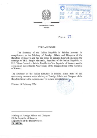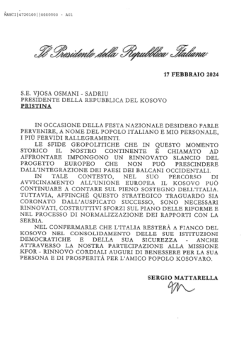 Presidentja e Republikës së Kosovës, Vjosa Osmani, me rastin e 17 shkurtit, Ditës së Pavarësisë, ka pranuar telegram urimi nga Presidenti i Italisë, Sergio Mattarella.