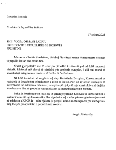 Në letrën e tij, Presidenti Mattarella ka thënë se Italia do të qëndrojë përkrah Kosovës në konsolidimin e institucioneve demokratike dhe sigurinë e saj, përcjell Arbresh.info.