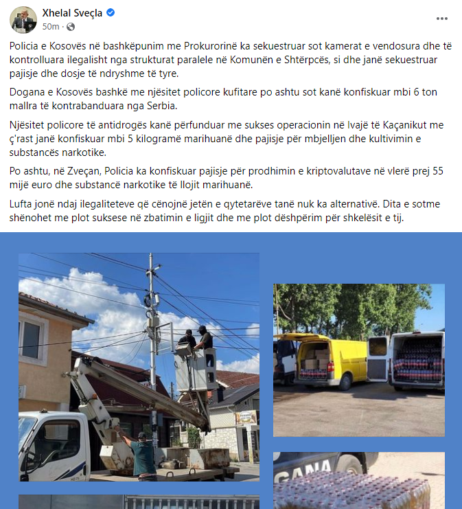 Ministri i Punëve të Brendshme, Xhelal Sveçla, ka numëruar aksionet e Policisë së Kosovës gjatë ditës së sotme, dhe ka thënë se “lufta jonë ndaj ilegaliteteve që cenojnë jetën e qytetarëve tanë nuk ka alternativë”.