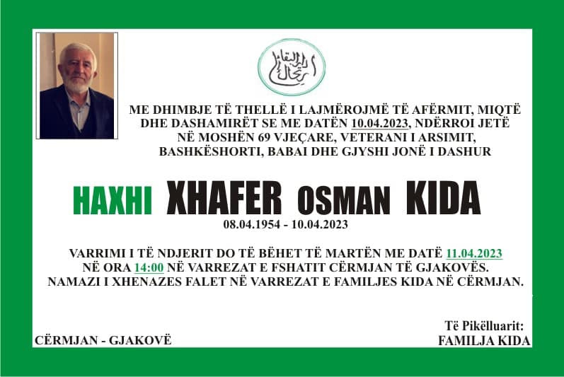 Varrimi i tij do të bëhet nesër në fshatin Cërmjan të Gjakovës, nga ora 14:00./Arbresh.info